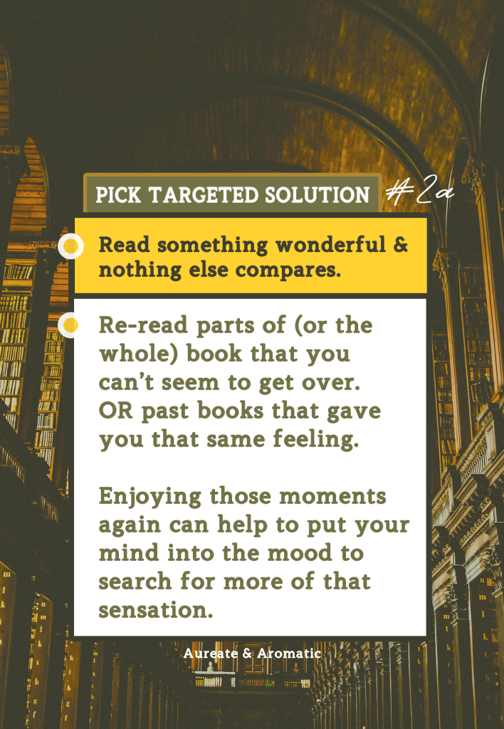 If you’re someone who can read a book you’ve just finished again shortly afterwards, then you can try that instead of delving into a past read. I personally am not, but everyone’s different. The aim is to just have that itch you’re feeling scratched so that you can go into your next read without an immediate sense of disappointment when you don’t get the experience you’re craving.