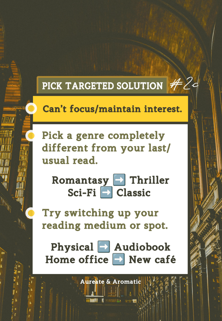 Exploring a new place and trying to read there can also help to re-engage you since having a routine with the same places and a constant lack of reading may be hard to break out of. But going to a new location can help to introduce a new potential part to that routine.