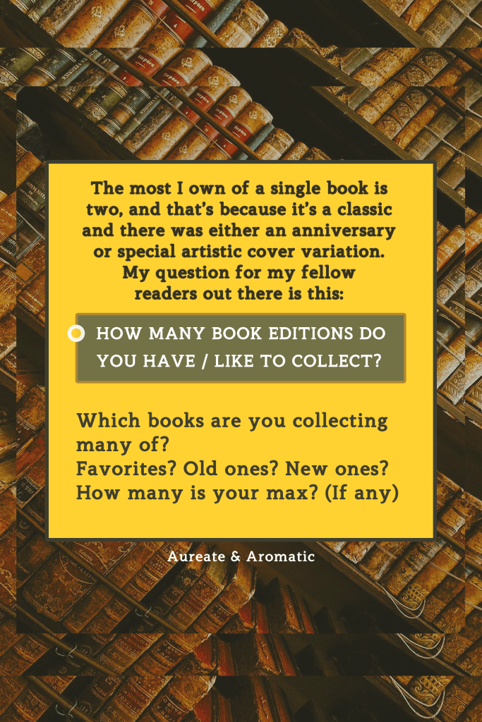 I personally am very tempted when I see gorgeous collector’s editions of books, or classic covers. But even so, I feel two is my max for the variations of a single book.