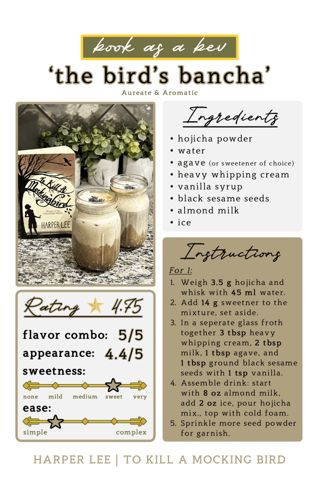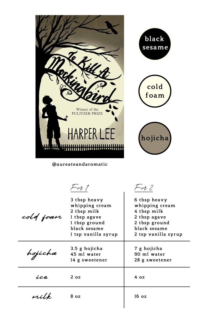 The first drink of my thirty day book as a bev series is a black sesame hojicha latte inspired by To Kill a Mockingbird by Harper Lee. A classic literature novel that most have had the chance to read fully, or in part, at some point during their school years.