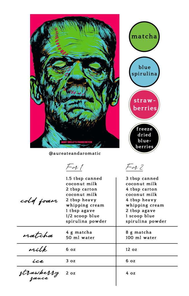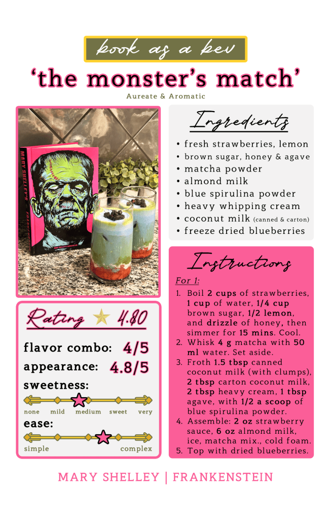 The second drink of my thirty day book as a bev series is a strawberry matcha with coconut cold foam inspired by Frankenstein by Mary Shelley. Another classic!