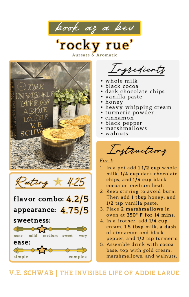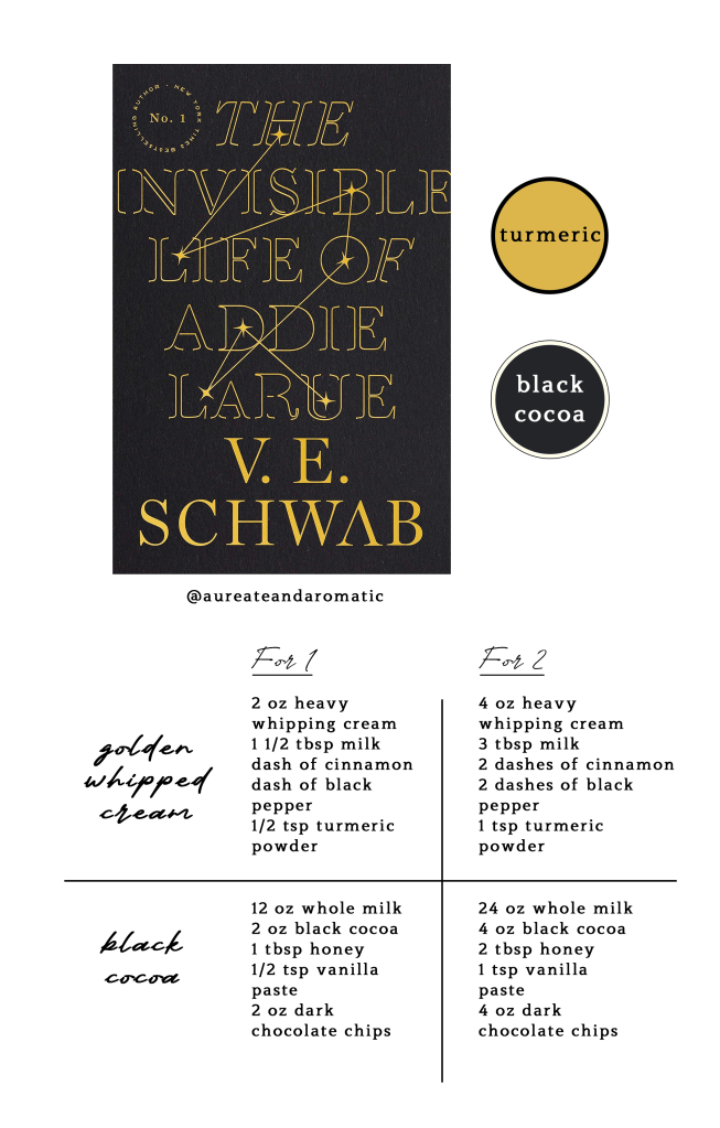 Without further ado~ The third drink of my thirty day book as a beverage series is a hot dark cocoa with golden whipped cream, topped with baked marshmallows and walnuts. This drink was inspired by The Invisible Life of Addie LaRue by V. E. Schwab! This book coincidentally is celebrating its fifth year anniversary this week, which is insane to me as I distinctly remember picking it up at the bookstore when it dropped like it was yesterday. What do you mean it’s been five years?