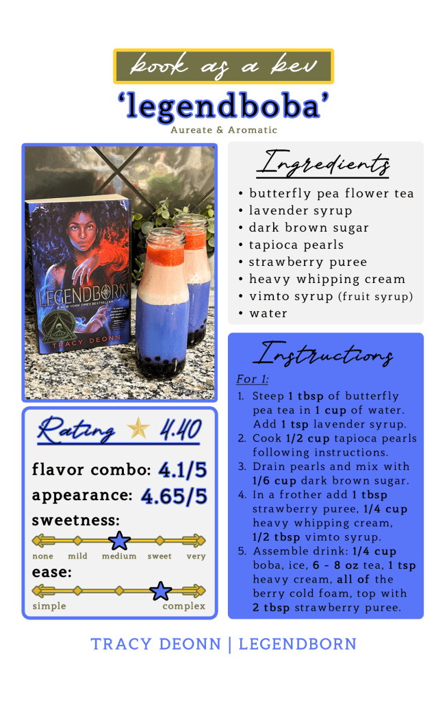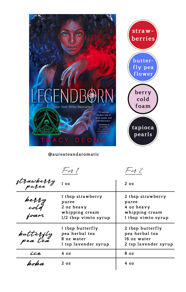 The seventh drink of my thirty day book as a beverage series – and rounding out the first week – is a boba tea inspired concoction that has a butterfly tea base with a hint of lavender and cream, a berry cold foam made with vimto, and a topping of fresh strawberry puree. This drink is drawn from my paperback copy of Legendborn by Tracy Deonn, a book I’m itching to knock off the tbr.