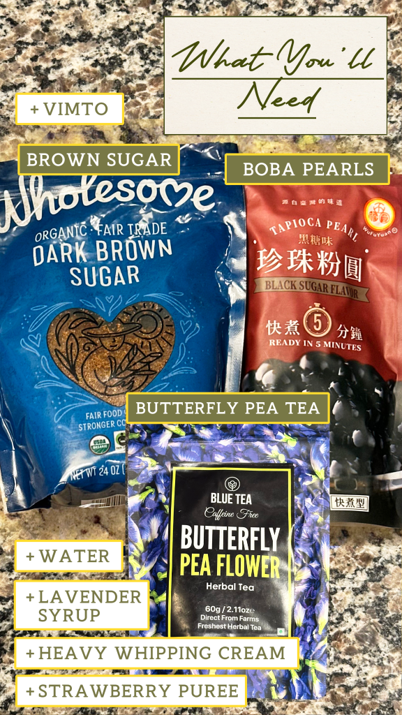 Boba: I love boba, and knew the tapioca pearls could serve as the nice dark base for the drink. My preferred means of sweetening them is with brown sugar, so that’s what I used. You can use honey or white sugar or any sweetener of choice. After a quick boil and cool, they were ready to be used.