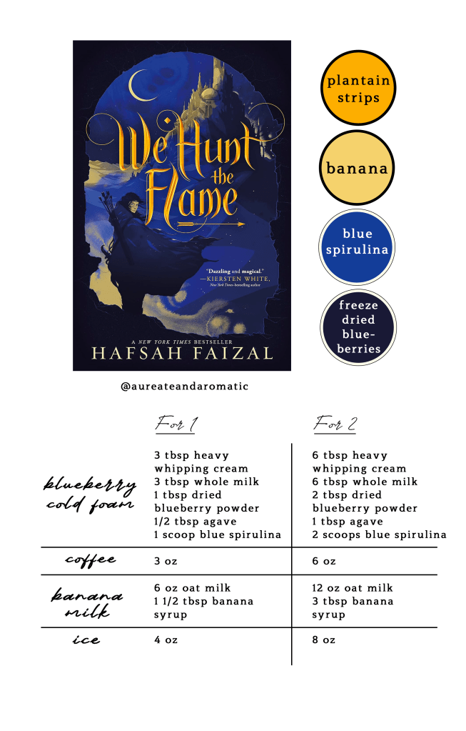 The eleventh drink of my thirty day book as a beverage series is an iced latte with banana oat milk and a blueberry cold foam. The colors were pulled from my paperback edition of We Hunt The Flame by Hafsah Faizal.