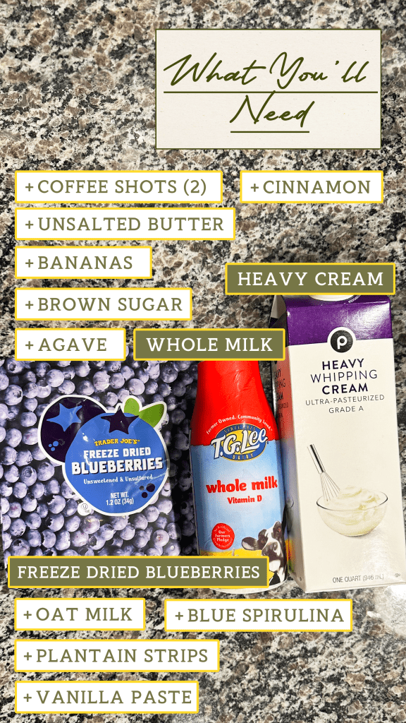 Blueberry Cold Foam: I don’t normally add fruit syrups or cold foams to my lattes, but since this recipe has a banana base, I thought the addition of blueberry could accentuate that – not to mention, the color would be ideal for the cover. When I blended freeze dried blueberries and added it to the cold foam, the result was a much more purple hue than I’d envisioned. So I added some blue spirulina to balance the color out. The resulting foam was so delicious, I imagine having it with a latte that doesn’t have banana would still work just as well!